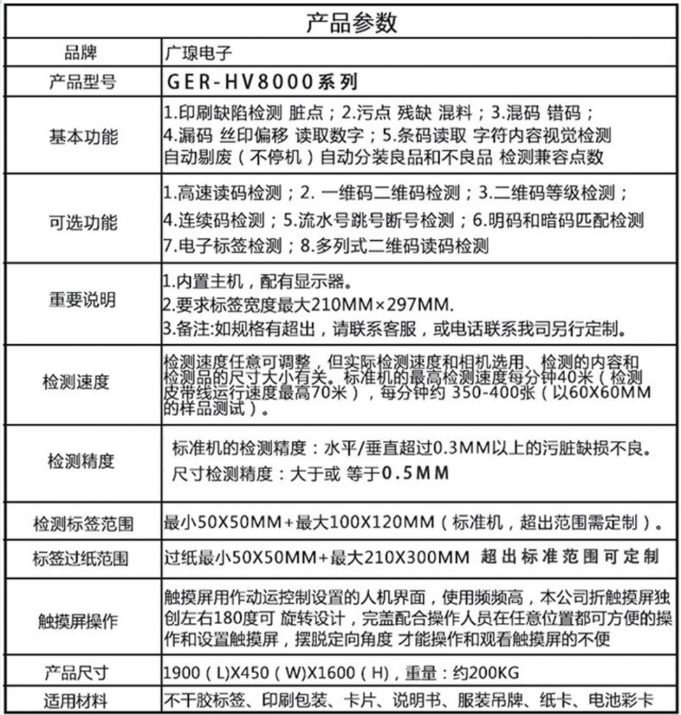 - 單張品檢機型號:GER-HV8002 項目簡介: 廣瑔單張品檢機主要是通過自動化平臺將每一張吊牌或紙卡傳送到視覺檢測系統下方進行ccd采集,系統檢……