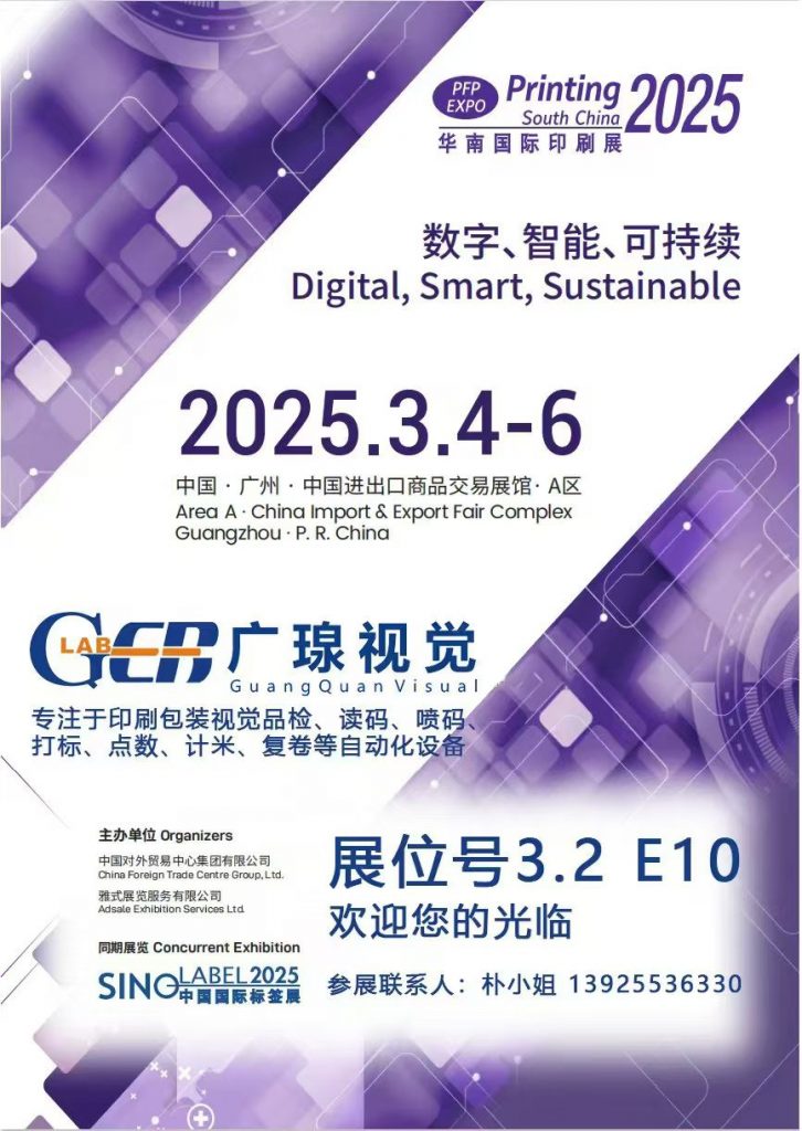 2025年3月4日至6日,廣瑔視覺將攜前沿技術與創新解決方案,正式亮相2025年華南國際印刷展(Printing 2025)。本屆展會以數字、智能、可持續”為核心主題,匯聚全球印刷包裝行業頂尖企業,展示智能化、綠色化轉型成果。廣瑔視覺展位位于中國進出口商品交易展館A區3.2 E10,誠邀行業伙伴共探技術革新與可持續發展新機遇。